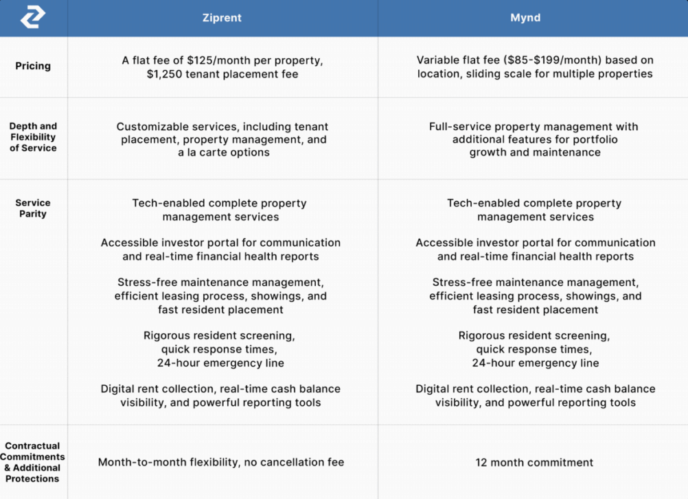 Conversely, Mynd’s strength is full-service property management, specifically for multifamily buildings. Mynd tends to follow a more traditional long-term contract model, which can appeal to landlords with more extensive portfolios. The differences between Ziprent and Mynd show the diverse needs of today’s property owners, giving them options that fit their particular property management goals.
